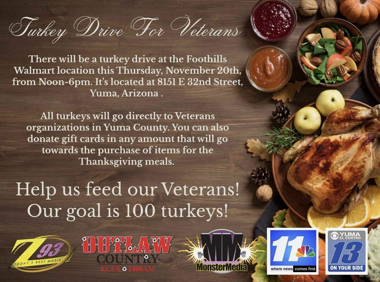 A turkey drive is planned for the Foothills Walmart on November 20, from 12-6 p.m. All donated turkeys are going towards veteran organizations in yuma County. Gift cards are also accepted if they go towards Thanksgiving meals. Help feed those who served and get to the donation goal of 100 turkeys.