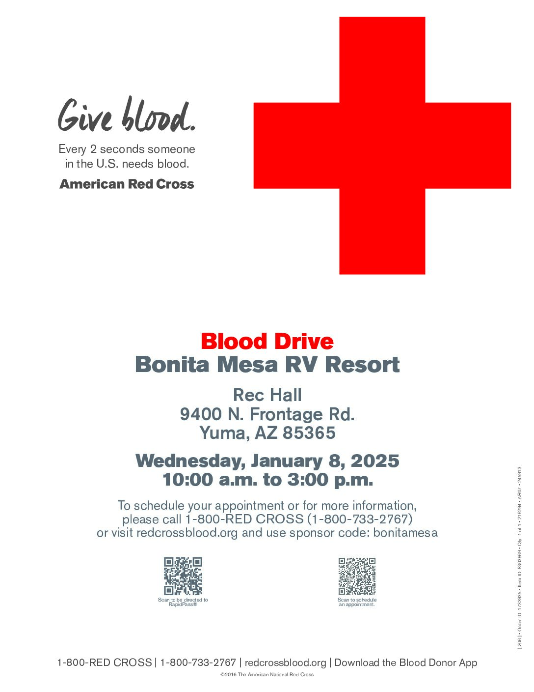 Every 2 seconds, someone in the U.S. needs blood. Bonita Mesa RV Resort Rec Hall 9400 N. Frontage Rd. Yuma, AZ 85365 Wednesday, January 8, 2025 10:00 a.m. to 3:00 …