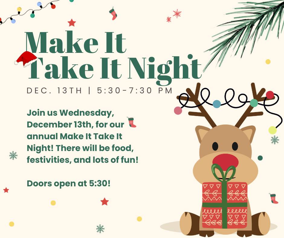 Join us Wednesday, December 13th, for our annual Make It Take It Night! There will be food, festivities, and lots of fun! Doors open at 5:30!