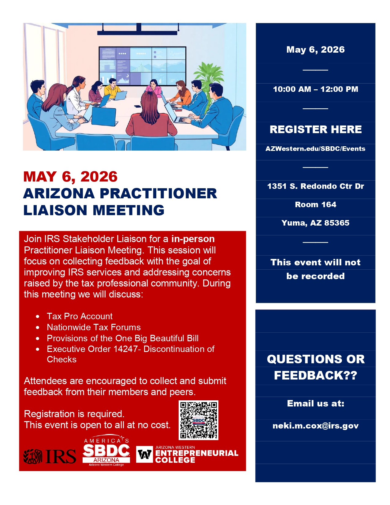 The Small Business Development Center (SBDC) at Arizona Western College, in partnership with the IRS Stakeholder Liaison, will host the Arizona Practitioner Liaison Meeting, an in-person event created for tax professionals, practitioners, and community members to share feedback and learn about important tax updates. The meeting will take place on Wednesday, May 6, 2026, from …