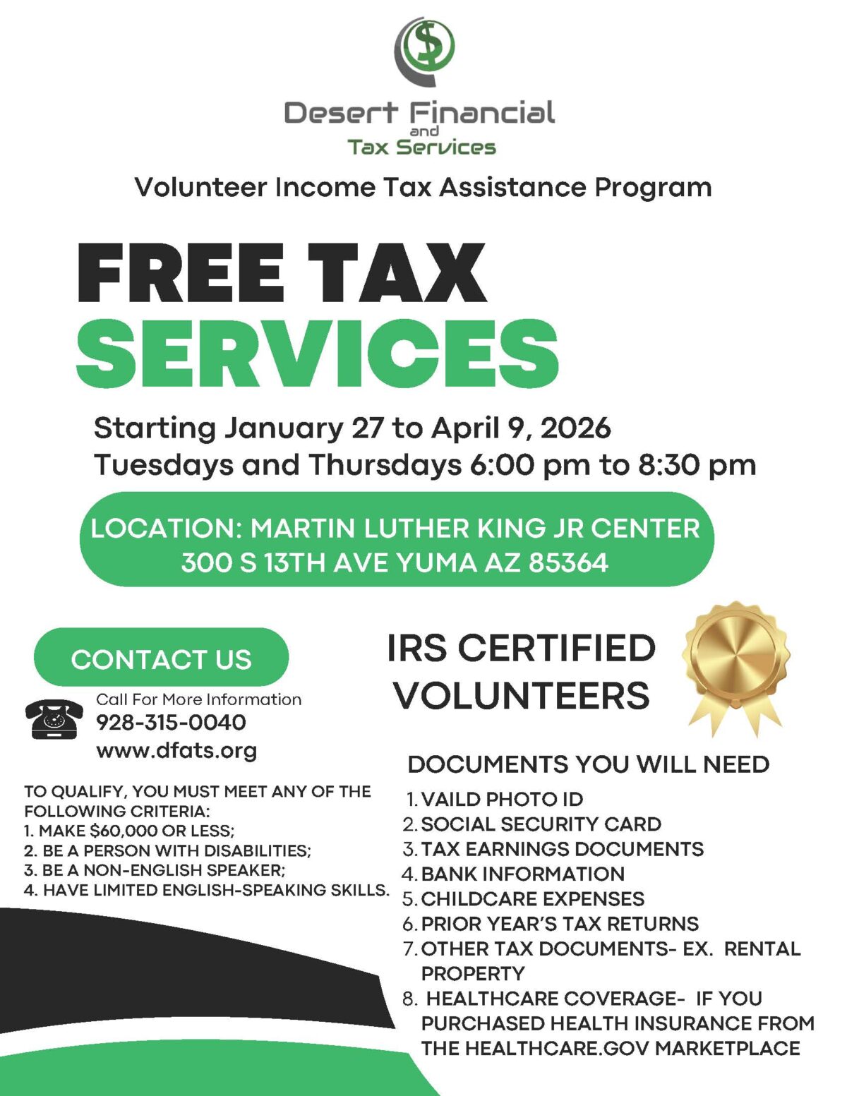 ¡Prepárese para una temporada de impuestos sin complicaciones! Nuestro servicio gratuito de impuestos VITA 2025 comienza el 27 de enero de 2026 en el Martin Luther King Jr. Youth Career Center, ubicado en 300 S. 13th Ave., Yuma, AZ. Únase a nosotros todos los martes y jueves por la noche de 6:00 p.m. a 8:30 p.m. hasta el 9 de abril de 2026. ¡No pierdas esta valiosa oportunidad!