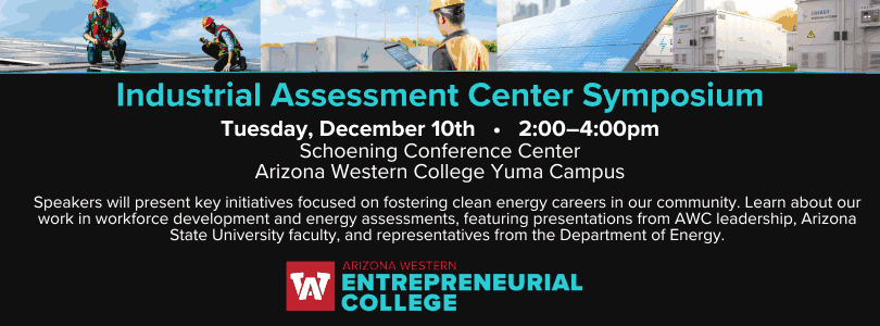 Schoening Conference Center, 3C Building, AWC Yuma Campus 2020 S. Ave. 8E, Yuma, AZ, United StatesArizona Western College is hosting the Industrial Assessment Center Symposium. The event is happening on Tuesday, December 10 at the 3C Schoening Conference Center, located at the Yuma Campus, from 2:30 p.m. to 4:00 p.m. AWC says the symposium is focusing on "advancements in energy efficiency and the no-cost energy assessments available to local manufacturing …