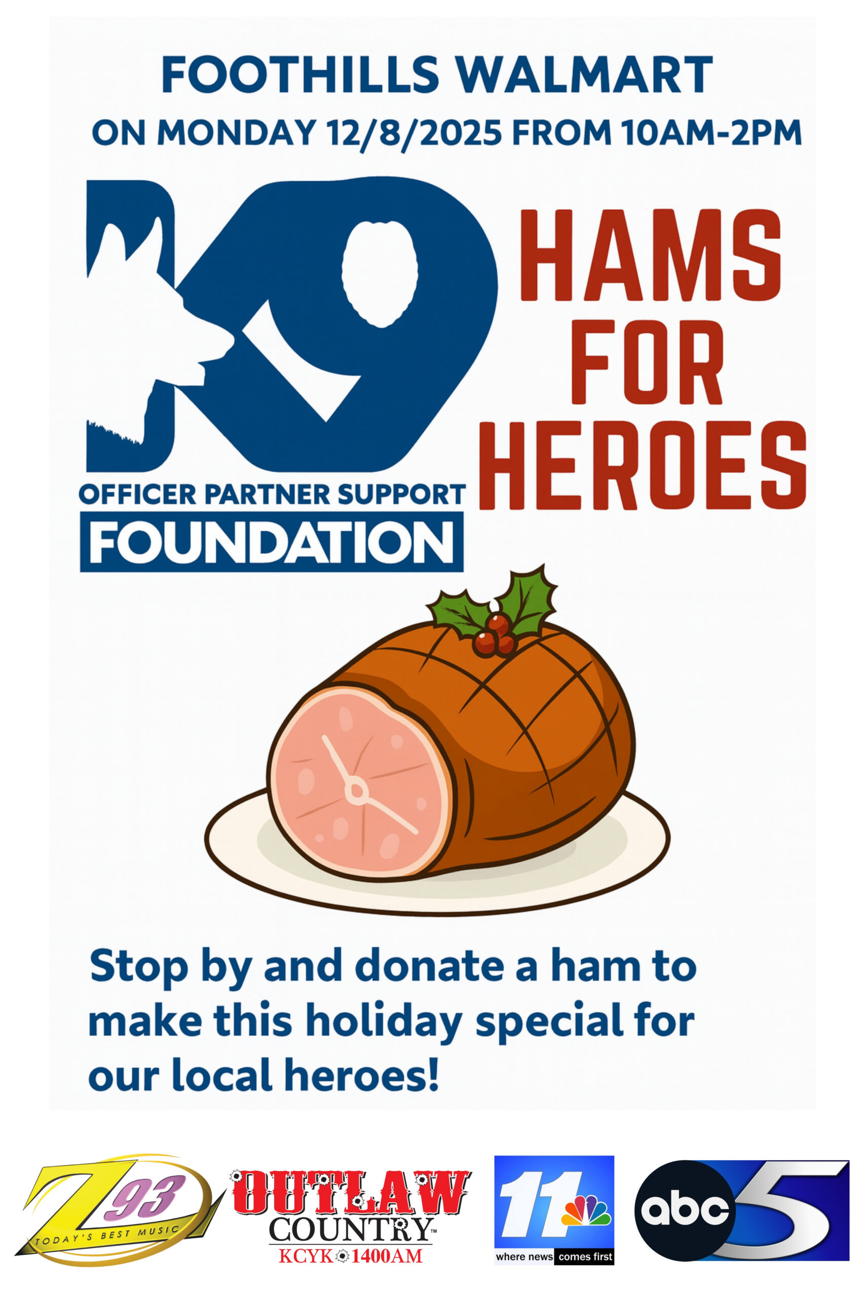 Walmart Foothills 8151 E 32nd Street, Yuma, AZ, United StatesThe K9 Officer Partner Support Foundation is hosting Hams for Heroes at the Yuma Foothills Walmart. Ham donations will be going towards locals. You can donate on Monday, December 8 from 10 a.m. to 2 p.m.